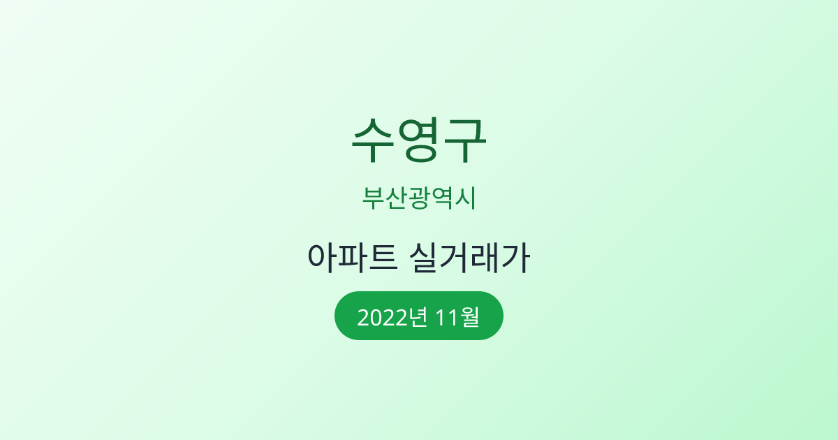 2022년 11월 부산광역시 수영구 아파트 매매 실거래가 정보입니다. 국토교통부 공식 데이터를 기반으로 합니다.