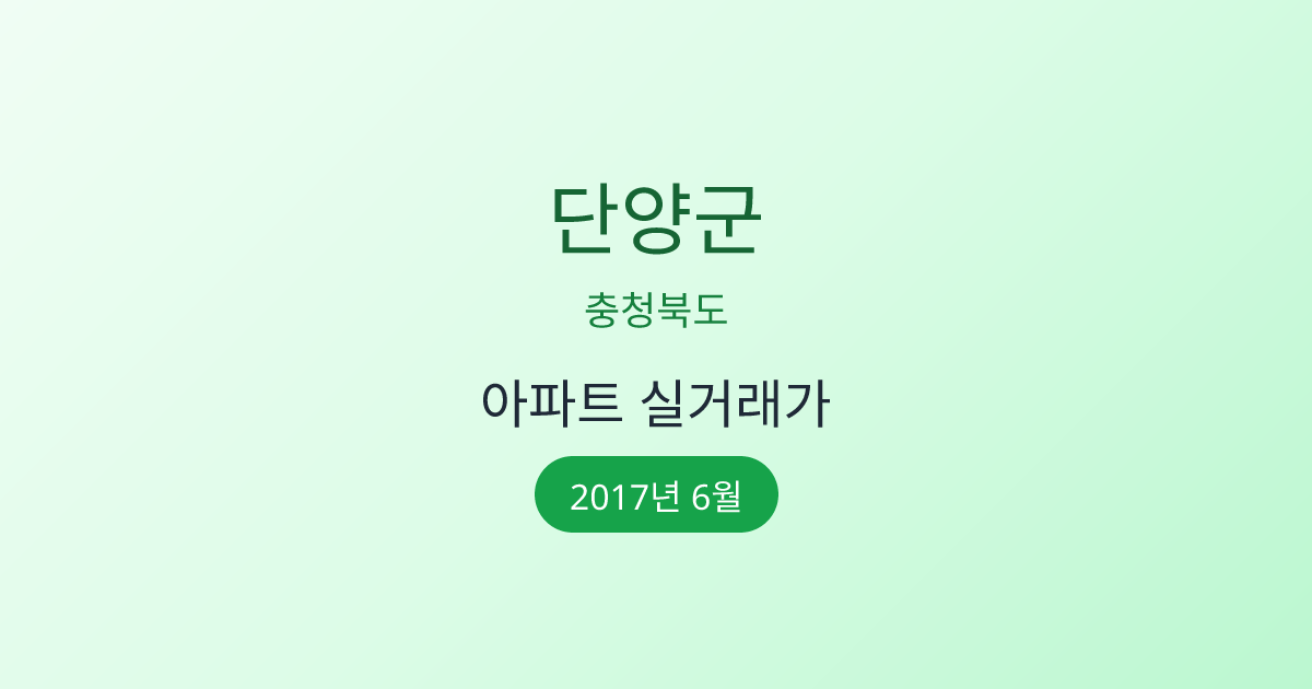 2017년 6월 충청북도 단양군 아파트 매매 실거래가 정보입니다. 국토교통부 공식 데이터를 기반으로 합니다.
