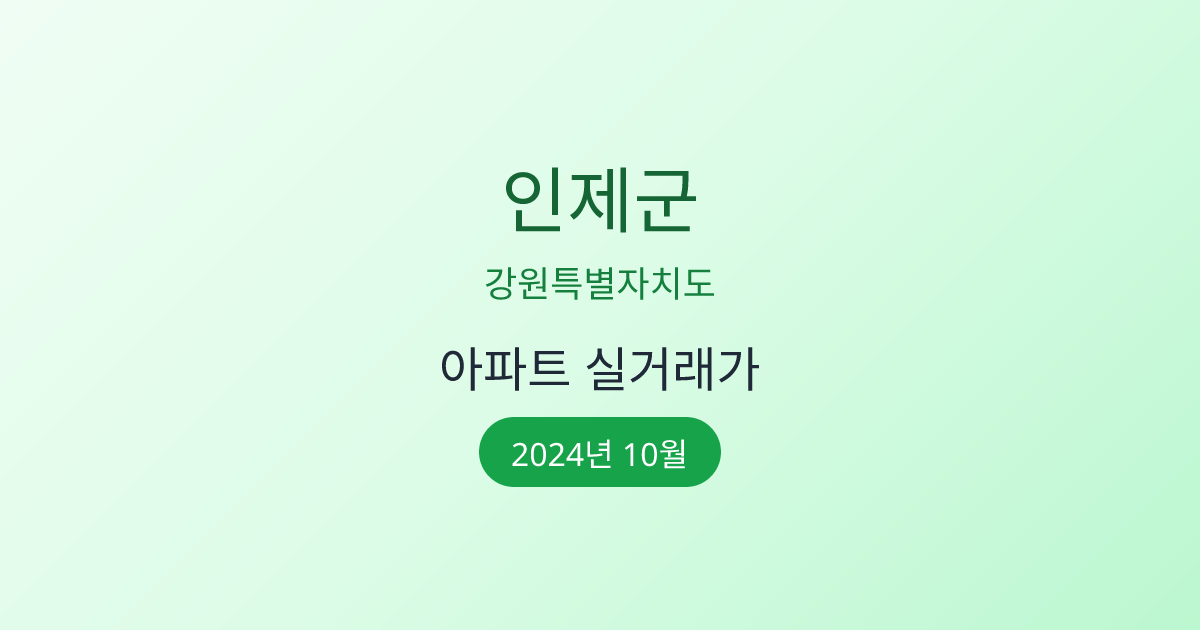 2024년 10월 강원특별자치도 인제군 아파트 매매 실거래가 정보입니다. 국토교통부 공식 데이터를 기반으로 합니다.