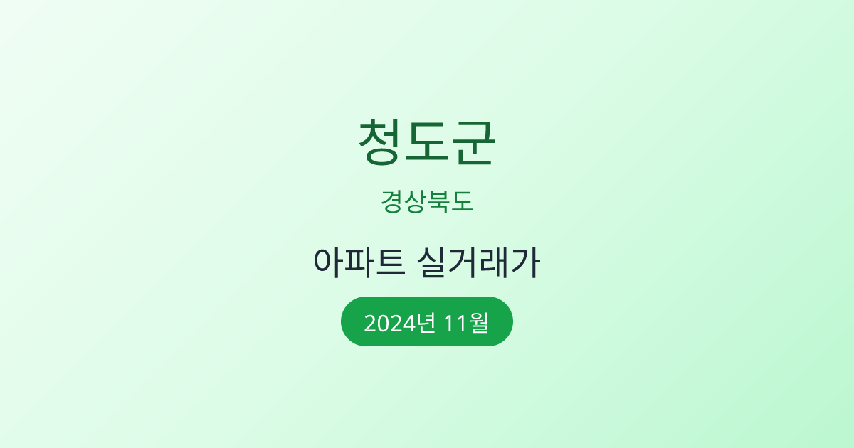 2024년 11월 경상북도 청도군 아파트 매매 실거래가 정보입니다. 국토교통부 공식 데이터를 기반으로 합니다.