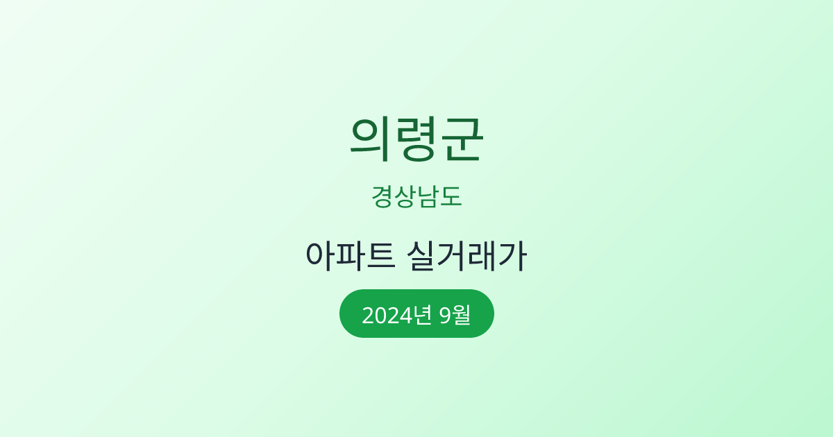 2024년 9월 경상남도 의령군 아파트 매매 실거래가 정보입니다. 국토교통부 공식 데이터를 기반으로 합니다.