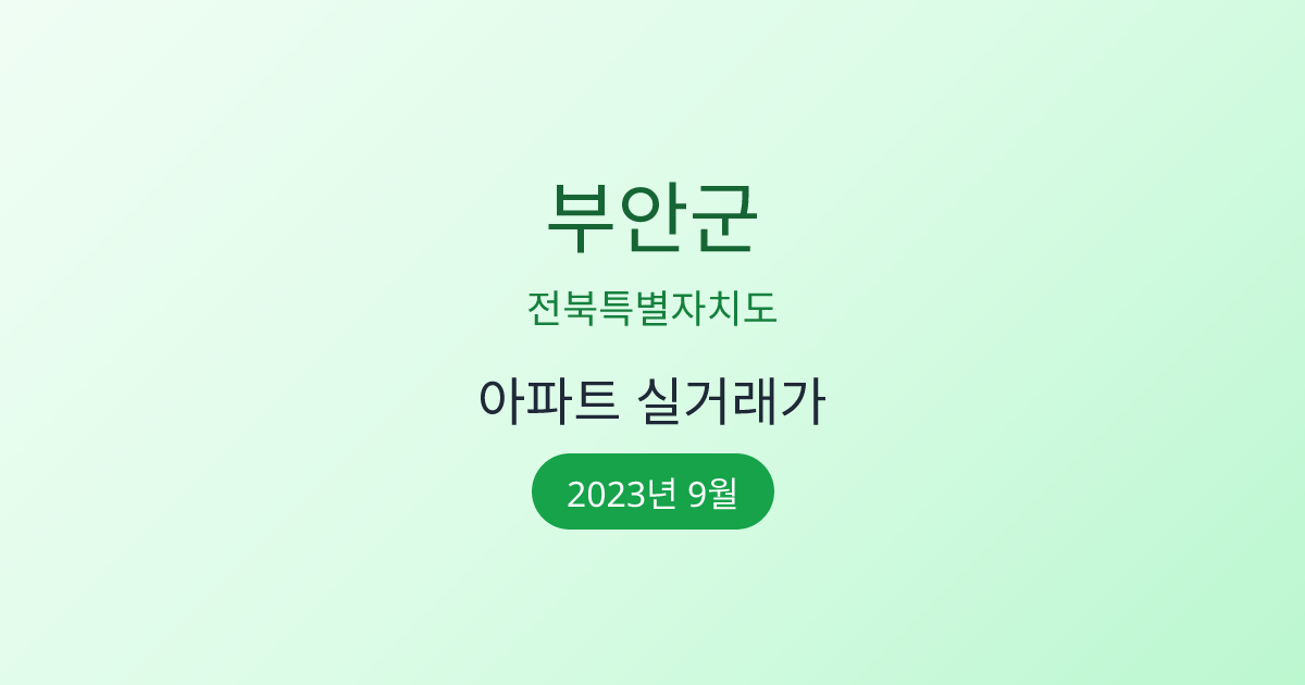 2023년 9월 전북특별자치도 부안군 아파트 매매 실거래가 정보입니다. 국토교통부 공식 데이터를 기반으로 합니다.