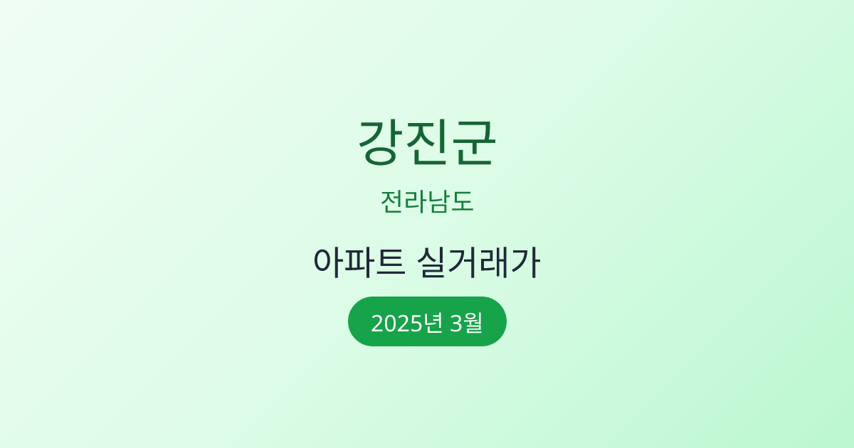 2025년 3월 전라남도 강진군 아파트 매매 실거래가 정보입니다. 국토교통부 공식 데이터를 기반으로 합니다.